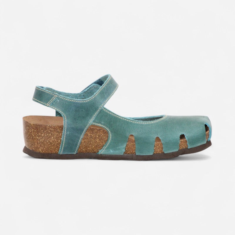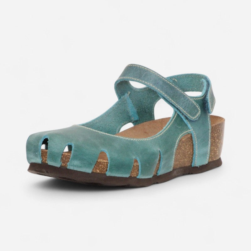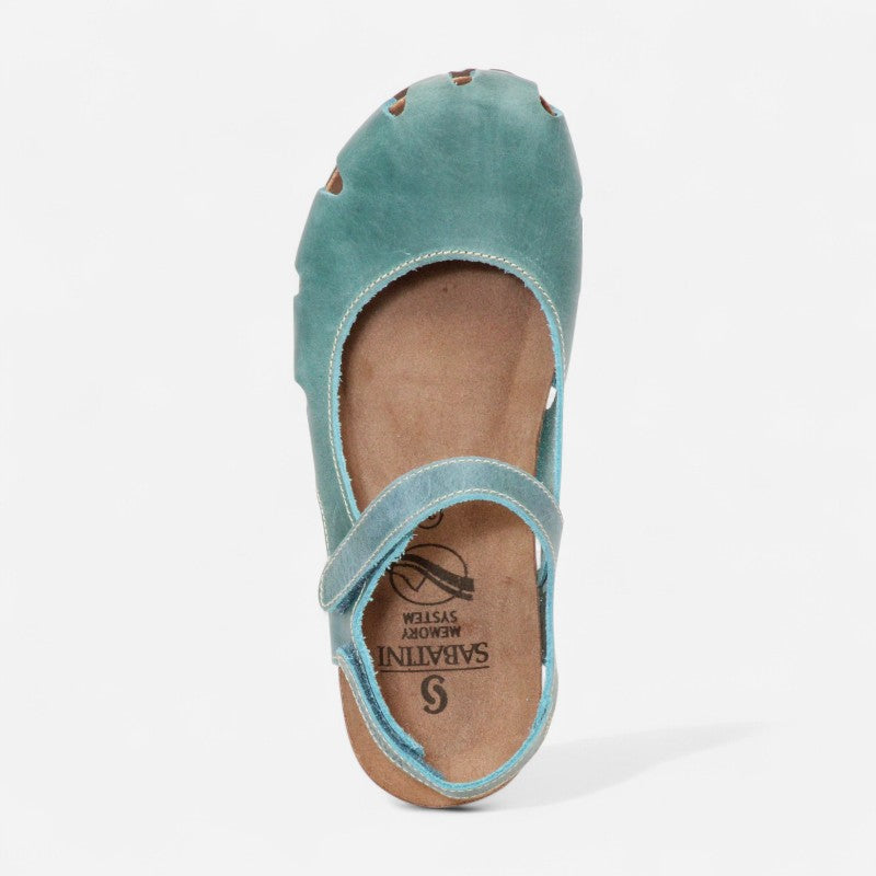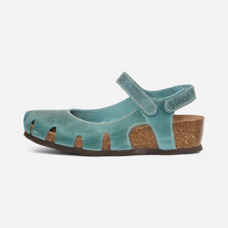These cute and playful covered-toe sandals from Sabatini have soft leather uppers with a velcro Mary Jane strap and a velcro closure around the heel. The leather lined footbed provides lightly cushioned arch support. With a lightweight cork base and rubber sole, you can wear these sandals all day!