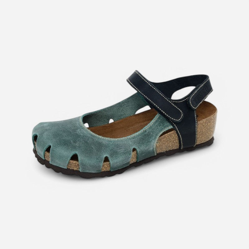 These cute and playful covered-toe sandals from Sabatini have soft leather uppers with a velcro Mary Jane strap and a velcro closure around the heel. The leather lined footbed provides lightly cushioned arch support. With a lightweight cork base and rubber sole, you can wear these sandals all day!