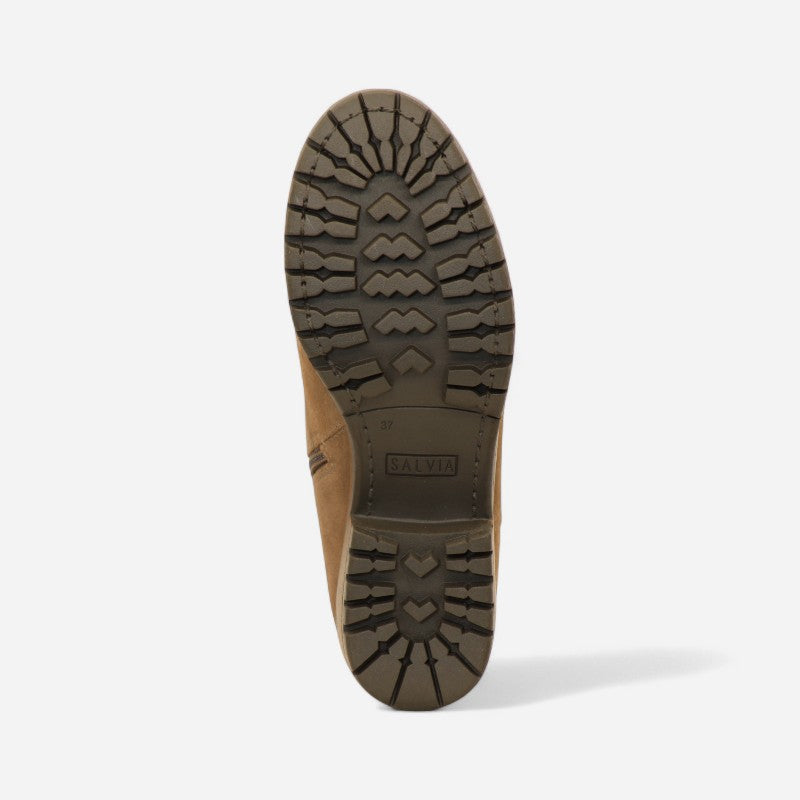 - Waterproof suede with a side zipper and 2-inch stacked heel.