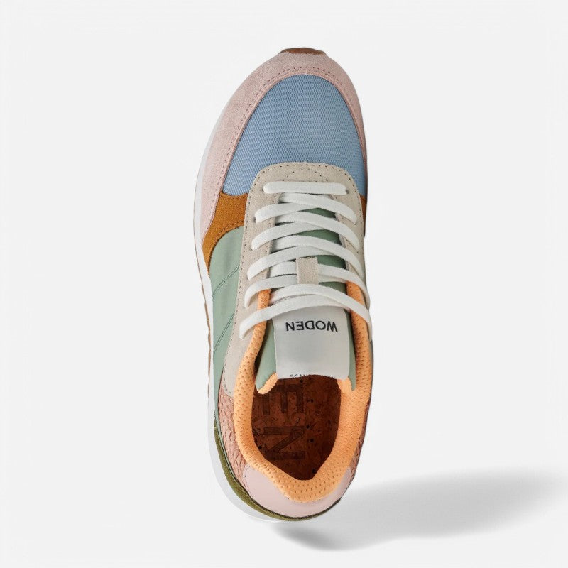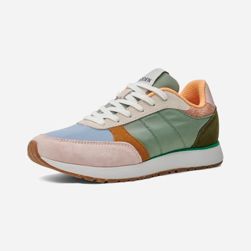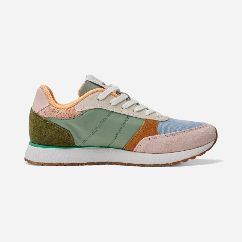 Ronja is based on an innovative design with cool color blocked details and a sporty design, crafted in leather and textile with fish leather details on the heel.